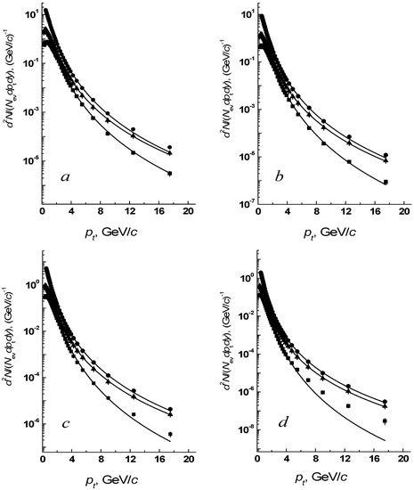 Successful analysis, using the function in Equation (5), of pt distributions of particles in collisions at high energies has been performed in [11,15,16,21,33]. The model represented by the function in Equation (5) is a powerful tool, which probes the long pt ranges of particles, allowing to compare different collision systems using few parameters [15,16,21,33]. The global parameters and T0 obtained in [33] in central Cu + Cu, Au + Au, and Pb + Pb collisions at mid-y at (snn)1/2 = 200–2760 GeV at the RHIC and LHC, applying the modified Hagedorn function in Equation (5) over the long pt range, have reproduced all the observed dependencies of and T0 on <Npart> and (snn)1/2, extracted using three different transverse expansion (blast-wave) models in the low pt range. The values of in the most central (0–5%) Pb + Pb collisions at (snn)1/2 = 2.76 and 5.02 TeV, extracted using the function in Equation (5) over long pt ranges in [16], have agreed within fit errors with the respective values of , obtained by ALICE collaboration in the most central (0–5%) Pb + Pb collisions at (snn)1/2 = 2.76 and 5.02 TeV in [34] and [57], respectively, using the combined Boltzmann–Gibbs blast-wave fits applied over low pt regions. Simultaneous fits with the modified Hagedorn function in Equation (5), applied over long pt intervals in [16], have confirmed that grows and T0 decreases with increasing the collision centrality in Pb + Pb collisions at (snn)1/2 = 2.76 and 5.02 TeV, which agrees well with the similar result of ALICE collaboration obtained from combined Boltzmann–Gibbs blast-wave fits in the low pt ranges in the same collisions in [34,57].