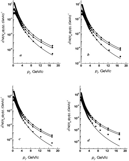 Similarly, to describe the pt spectra, d2N/(Nevdptdy), of particles in the present work, we applied the Hagedorn function with included transverse flow (Equation (5)) in the following form: