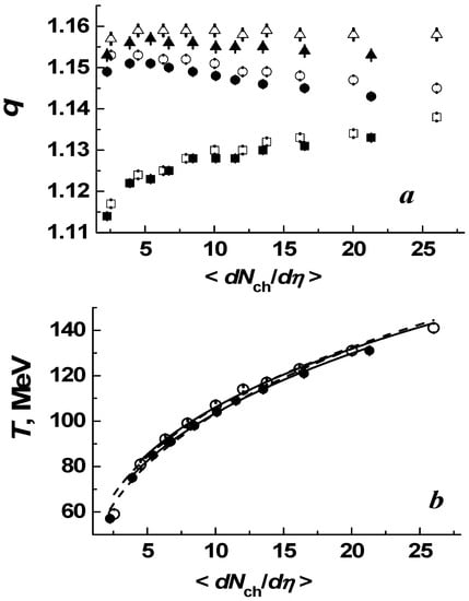 (a)—The <dNch/dη> dependencies of the obtained q values of the Tsallis function with thermodynamical consistence, presented in Table 2, for the charged pions (●) and kaons (▲), protons and antiprotons (■) in proton-proton collisions at (s)1/2 = 7 TeV. (b)—The same for the obtained effective temperatures T (●) of the Tsallis function with thermodynamical consistence, presented in Table 2. The corresponding results extracted from [21] for the respective charged particles in proton-proton collisions at (s)1/2 = 13 TeV are shown by the corresponding open (hollow) symbols for comparison. The data points in panel (b) are fitted with the simple power function , where A is the normalization constant, and α is the exponent parameter. The dashed and solid curves are the simple power function fits of the whole range (10 data points), and of the whole range excluding the first data point (9 data points), respectively.