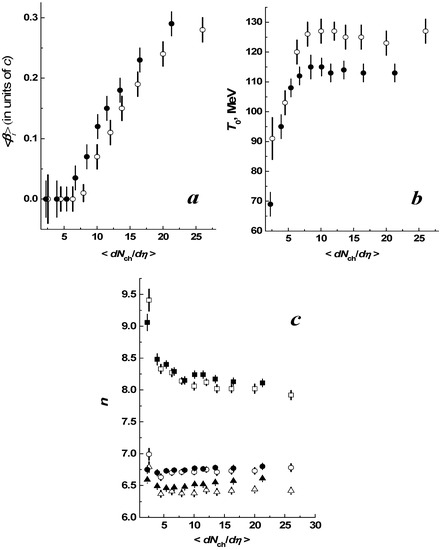 It was observed from Figure 4a that values, obtained employing the Hagedorn function with included transverse flow, are essentially zero in the range <dNch/dη> < 6 (the first three data points) in proton-proton interactions at (s)1/2 = 7 TeV. As observed in Figure 4a, beginning from <dNch/dη> ≈ 6, the transverse flow starts emerging and developing, with parameter growing steadily in region <dNch/dη> > 6 until the largest <dNch/dη> values. The corresponding parameter T0 grows systematically in the low-multiplicity region <dNch/dη> < 6 (the first three data points) and does not change within the fit uncertainties in the broad region <dNch/dη> > 6 in proton-proton interactions at (s)1/2 = 7 TeV. The broad plateau range of T0 starting at <dNch/dη> ≈ 6 in Figure 4b goes along with a simultaneous and systematic rise of with increasing <dNch/dη> in the wide region <dNch/dη> > 6 in Figure 4a. The observation that the temperature, T0, first rises in the range <dNch/dη> < 6, reaching a wide plateau beginning at <dNch/dη> ≈ 6, which matches the absence of transverse flow at <dNch/dη> < 6 and the emergence and systematic increase of at the wide range <dNch/dη> > 6, suggests the probable onset of deconfinement phase transition at <dNch/dη> ≈ 6 in proton-proton interactions at (s)1/2 = 7 TeV. The and T0 versus <dNch/dη> dependencies in collisions of protons at (s)1/2 = 7 TeV, as observed from Figure 4a,b, qualitatively match those in collisions of protons at (s)1/2 = 13 TeV obtained in [21], with some differences observed in the absolute values of parameters. It is seen in Figure 4a,b that the absolute values of are noticeably smaller and the <dNch/dη> value for the probable onset of phase transition and the value of T0 in the plateau region are larger in p + p collisions at (s)1/2 = 13 TeV as compared to those at (s)1/2 = 7 TeV. It has been estimated in [21] from the analysis of T0 and versus <dNch/dη> dependencies that the expected onset of deconfinement phase transition in proton-proton collisions at (s)1/2 = 13 TeV takes place at <dNch/dη> ≈ 7.1 ± 0.2. We have followed a similar procedure as that in [21] to better estimate the critical value of <dNch/dη> for the probable onset of deconfinement phase transition in collisions of protons at (s)1/2 = 7 TeV: The critical <dNch/dη> is estimated to be the middle value on the <dNch/dη> axis between the third and fourth points in Figure 4b, which correspond to <dNch/dη> = 5.40 ± 0.17 and <dNch/dη> = 6.72 ± 0.21, respectively, in Table 1. The respective estimate for the probable onset of deconfinement phase transition in p + p collisions at (s)1/2 = 7 TeV proved to be <dNch/dη> ≈ 6.1 ± 0.3, which is smaller than, but close to, the corresponding <dNch/dη> ≈ 7.1 ± 0.2 obtained in p + p collisions at (s)1/2 = 13 TeV in [21].