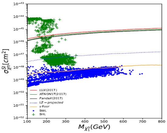 Figure 2. The scatter plots of the bino-like dark matter parameter space in the MSSM satisfying the relic density at the level (and also explaining the muon at the level), displayed in the plane of the direct detection limits on the spin-independent scattering cross-section with the nucleon, taken from the first ref. in [44].