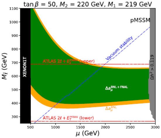 - In the low energy effective MSSM, the masses of bino, winos, higgsinos, smuons, and sneutrinos are all independent parameters. As shown in Figure 4 taken from [79] (see also [80,81]), under other constraints including the dark matter, the vacuum stability, and the LHC search for sleptons, there still remains a part of the MSSM parameter space which can explain the muon at the level [44,79,80,81].