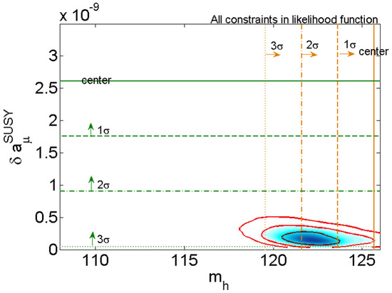 - In the constrained models with certain UV boundary conditions for the soft breaking parameters, such as mSUGRA/CMSSM and GMSB, the soft masses at the weak scale are correlated. To give a 125 GeV SM-like Higgs mass, the top squarks must be heavy and the correlated slepton masses cannot be as light as required by the explanation of the muon anomaly. Figure 5 and Figure 6 show the tension between the muon explanation and the 125 GeV SM-like Higgs mass as well as the LHC searches for the CMSSM/mSUGRA [79] with inputs at the GUT scale. To solve such a tension, these models need to be extended, e.g., coupling the messengers with the Higgs doublets to raise the tree-level SM-like Higgs mass [82,83] in gauge mediation or make the colored sparticles much heavier than uncolored sparticles at the weak scale [84,85,86,87,88,89]. In superGUT [90] or subGUT [91] scenarios for SUGRA, which adopts the UV input upon or below the GUT scale, there are still surviving parameter spaces that can account for both the muon anomaly and other constraints, such as the dark matter and collider searches. In the deflected AMSB, which is an elegant extension of AMSB, the muon anomaly can easily be explained [92,93,94,95,96]. The mixed mediation scenarios, such as the mirage mediation, can also successfully account for the muon anomaly [97,98].
