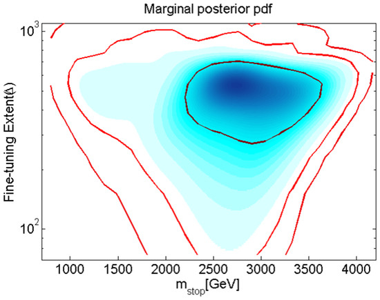 with being the independent SUSY parameters at the cut-off scale. In terms of this measure, in the CMSSM the fine-tuning extent is about per mille, as shown in Figure 7 [52]. The fine-tuning can be lower [31] if we use another measure [40,116]: