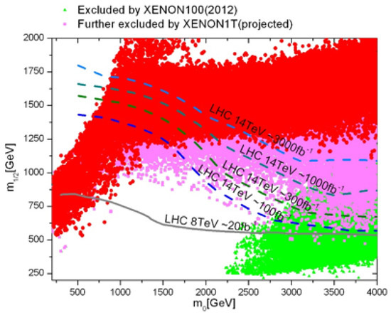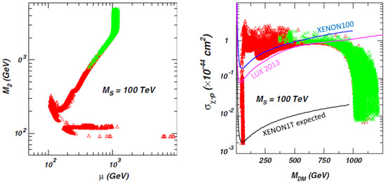 Note that in this review we focus on low energy SUSY which helps to solve the naturalness problem in particle physics. It is clear that even with low energy SUSY our particle theory still has a slight tuning, which means we cannot have perfect naturalness. If we give up naturalness and believe simplicity, we may have the fascinating split-SUSY [120,121,122,123], which is emphasized in the recent Witten Reflects [124]. Split-SUSY gives up naturalness and retains the original motivation to explain the dark matter and realize successful gauge coupling unification. Actually, as shown in Figure 8, the dark matter relic density and direct detection limits as well as the gauge coupling unification impose stringent constraints on the parameter space of split-SUSY, i.e., only the higgsino-like dark matter around 1.2 TeV can survive the XENON1T limits assuming the universal GUT input for gaugino masses (which leads to at the weak scale). Since in split-SUSY the gauginos and higgsinos are not so heavy, they may be accessible in future colliders [125,126]. This is because the electroweak scale is not natural in the customary sense, but additional particles and forces that would help us understand what is going on exist at an energy not too much above LHC energies [124].