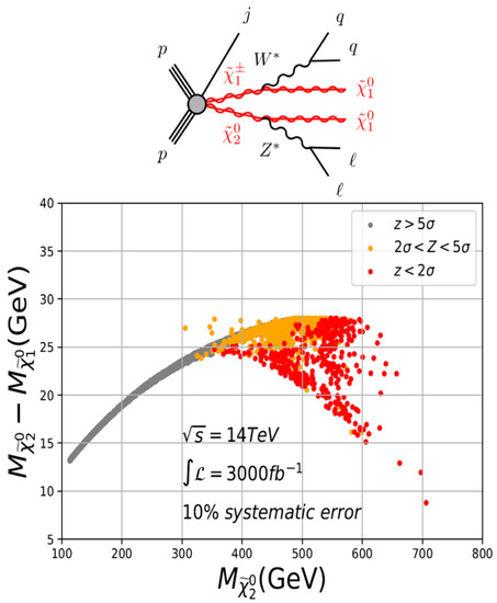 As shown above, the MSSM can allow for an explanation for the muon at the level while satisfying all other constraints. The light electroweakinos and sleptons required for the muon explanation may be accessible at the HL-LHC. For example, in the scenario where bino-like dark matter annihilates with winos to give the correct dark matter abundance, the light winos required by the muon may be fairly well produced and detected through the signal of soft leptons plus missing energy at the LHC, as shown in Figure 9 [44]. The parameter space shown in this figure was allowed by the muon , the dark matter relic density, and direct detection limits as well as the LHC Run-2 data [44]. We see that the HL-LHC can cover a sizable part of the MSSM parameter space for the explanation of muon at the level. In addition, the precision measurement of the Higgs properties at a lepton collider as a Higgs factory could play a complementary role via detecting the residual effects of SUSY in Higgs couplings [44,127].