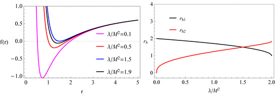 In the limit of , we would like to obtain the Schwarzschild BH, hence we accept only the positive branch as a physical solution. This also means that decreases with due to the stringy corrections. In addition, the last equation requires for a horizon to exist, which gives the following constraint . In Figure 1, we show the metric function and the horizons for different values of . In Figure 2 (left panel), we show the parametric region of M and . Since and are just parameters, we can introduce a new quantity, , and write metric function (21) as follows: