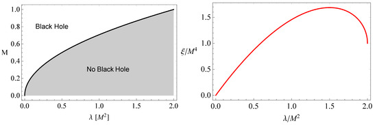 Left panel: Parametric plot between the mass of the black hole and the parameter . Right panel: Parametric plot between and the parameter . We have set .