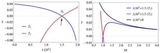 This equation really shows that, at this critical value of , a black hole with mass M will have zero Hawking temperature and, in general, the critical value of depends on the black hole mass. We can see what exactly happens in Figure 4. If we fix for simplicity the black hole mass to unity [, in the interval , the temperature becomes negative, which is not physically acceptable. However, as we will explain below, this is a consequence of the fact that, for , the horizons switch places, and the outer horizon will be located at . Thus, in this region, Hawking temperature should be associated with the horizon , that is,