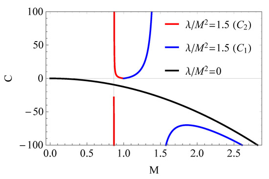 In Figure 5, we plot the heat capacity of the black hole as a function of M for a fixed parameter . We can see that the total heat capacity of the black hole is obtained from the contribution of the horizon noted as (blue line) in the interval , and the contribution of (red line) in the interval . In particular, one can see that exhibits discontinuity and diverges at some critical points , which can be linked to the second order phase transition. At the point , there is a flip of sign in the heat capacity where the Hawking temperature attains a maximum value with . In the interval , we see that is positive and there is a discontinuity at the minimal mass . Beyond this point, the object is not a black hole; instead, it can be some regular object or a naked singularity. This means that the black hole is thermodynamically stable for , whereas it is thermodynamically unstable for . We also see that, in general, for large M, we have negative heat capacity , hence the black hole is unstable. For a fixed value , the heat capacity is exactly zero at , as expected, since the Hawking temperature becomes zero. It is also interesting to see that, for large values of M, the heat capacity gets closer and closer to the Schwarzschild black hole heat capacity, and it is also negative i.e., . We note that there is no phase transition for the Schwarzschild black hole as can be seen from Figure 5 (black line).