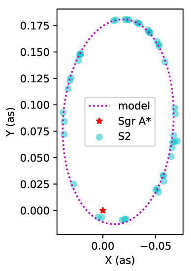- Gillessen, S.; Plewa, P.M.; Eisenhauer, F.; Sari, R.E.; Waisberg, I.; Habibi, M.; Pfuhl, O.; George, E.; Dexter, J.; von Fellenberg, S.; et al. An Update on Monitoring Stellar Orbits in the Galactic Center. Astrophys. J. 2017, 837, 30. [Google Scholar] [CrossRef] [Green Version]