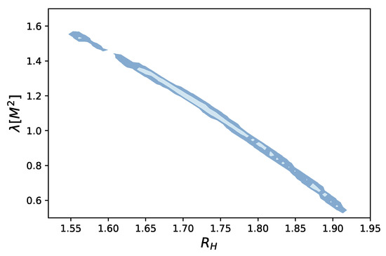 where the two observed and theoretical quantities are noted as , and , respectively. To find the best-fitting values, we use the Monte Carlo–Markov Chains analysis, with the uniform priors along with . In Figure 6 we give the orbit fit for our model. Our analyses show that the best-fitting value for the black hole parameter with confidence level is as shown in Figure 7. We also find the best fit value for the parameter within a confidence level. In SI units, after reinstating G and c, for the string coupling parameter, we obtain the following value: