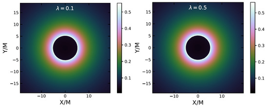 Black hole shadow images and the intensities of the 4D SCBH using an infalling gas and radiation model using different values of . We set the black hole mass to .