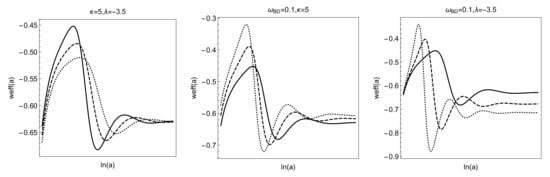 In Figure 2, we present the qualitative evolution for the effective equation of the state parameter for various values of the free parameters  where the hyperbolic inflation is a future attractor. The qualitative evolution of the dimensionless variables  are presented in Figure 3.