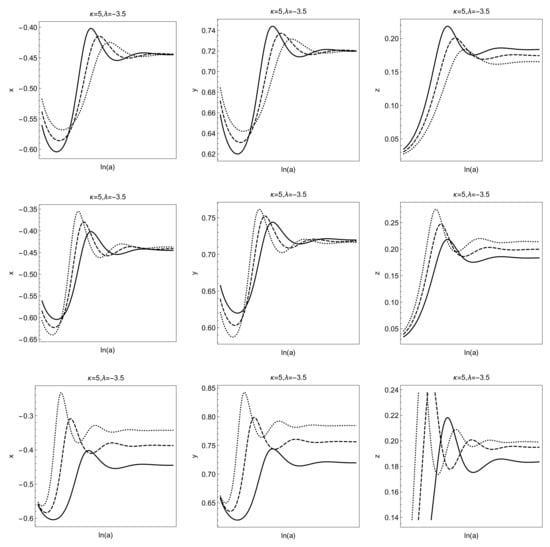 Qualitative evolution of the dimensionless variables  for various values of the free parameters . First row is for , and  (solid lines),  (dashed lines) and  (dotted lines). Second row is for ,  (solid lines),  (dashed lines) and  (dotted lines). Third row is for ,  (solid lines),  (dashed lines) and  (dotted lines).
