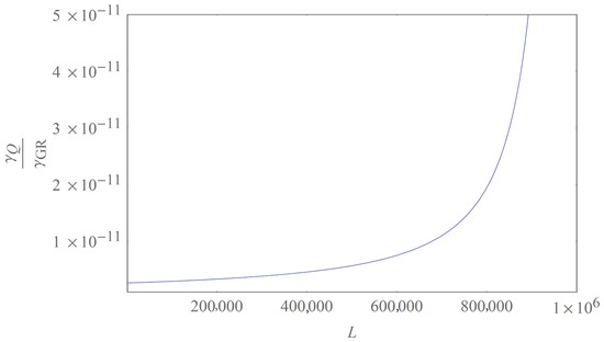 where we have restored standard units so as to let ℏ, c and G explicitly appear in the expression. We can then study the ratio as a function of the physical distance traveled by the neutrino. Because of the approximation we are currently considering, in generating the plot we fix and assume , since by taking the full expression (35) we would not gather an appreciable effect from the behavior of the curve. The results of the above analysis are summarized graphically in Figure 1.