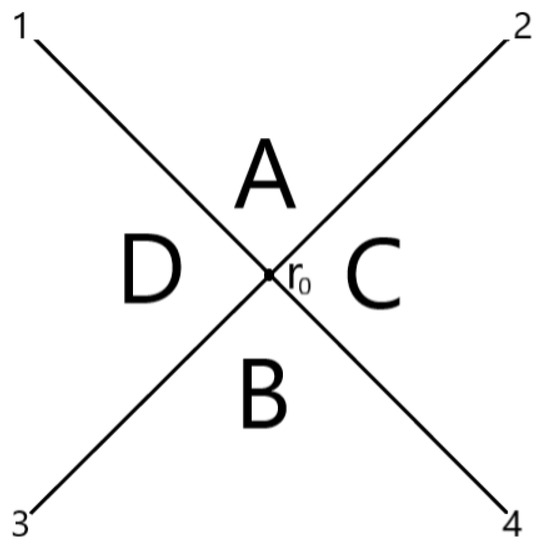 The specific type of perturbation we are going to consider is the same that was studied in [9]. As depicted in Figure 1, we consider two null shells, and , that intersect each other in a two surface S (that we will eventually move close to the inner horizon) of radius and produce two other null shells, and . The shells divide the spacetime into four regions. Let us denote the four regions A, B, C, and D, and the vectors tangent to the shells . The mass inflation instability develops in the region A between the two null shells and . The result follows straightforwardly from [9] (see also [10] for a more pedagogical description). However, ref. [9] focuses on general relativity, therefore it is useful to repeat the analysis here to explicitly show the underlying assumptions. We will see that the result can be obtained via purely geometrical considerations without specifying the dynamical equations of the theory.