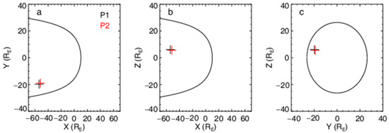 The location of P1 (red plus) and P2 (black plus) probes in GSM XY (a), XZ (b), and YZ (c) planes at 05:40 UT on 18 September 2016. The black curved lines represent the location of magnetopause obtained from Shue et al. [27]’s model.