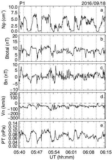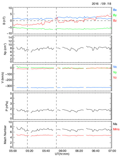 A chain of flux-transfer events (FTE) crossing through the spacecraft can produce quasi-periodic structures, which may be similar to the KH waves in the nonlinear stage [24,32,33]. For the FTE and KH wave, BN both have bipolar perturbations. However, the maximum value of the magnetic field strength often occurs at the edge of the vortex for the KH wave, and occurs at the core of FTE. The bipolar perturbations are also continuous for the KH wave. Another difference in the FTE and KH wave is that there exists a maximum value in total pressure at the center for FTE, and the maximum value of total pressure often occurs at the edge of the KH wave and the minimum value of total pressure often occurs at the center of the KH vortex. The characteristics of VN are also different; the VN of KH wave is quasi-steady and the perturbation of VN for FTE is relatively large and typically has a bipolar structure. In this event, BN has bipolar perturbations, and the peak value of magnetic field strength and pressure occur at the edge of the vortex for most of the time, as shown by the black dashed vertical lines in Figure 6. The perturbations of VN are small, smaller than 150 km/s, and there is no bipolar structure in VN. Therefore, we believe this is a KH-wave event. Note, however, that a total pressure peak at around 05:55 UT is probably not of a KH wave, but of an FTE event with bipolar By (Figure 2).