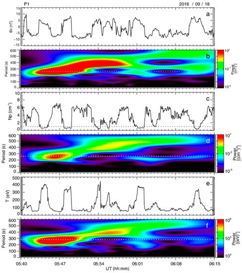 The Z component of the magnetic field (a), ion density (b), and ion temperature (c) observed by ARTEMIS P1 and their wavelet spectra (d–f) for interval 05:40 UT to 06:15 UT, 18 September 2016. The white horizontal lines represent the dominant period of each parameter.