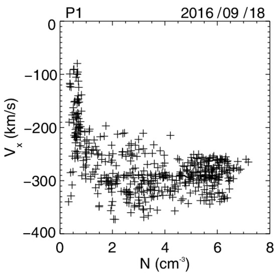A scatterplot of X component of solar-wind velocity (Vx) versus ion-number density from 05:40 UT to 06:15 UT. The low-density and faster-than-sheath plasma is the characteristic of rolled-up KH vortex, shown in the lower-left part of Figure 5.