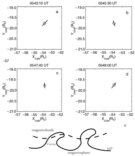 We further investigated the normal direction of the magnetopause using minimum-variance analysis of the magnetic field. Figure 7a–d presents the tangential planes of magnetopause estimated from the normal direction in the XY plane at 05:43:10 UT, 05:45:30 UT, 05:47:40 UT, and 05:49:00 UT. The ratio of the second to third eigenvalues of MVA are 9.09, 13.71, 9900, and 21.99, which indicate that the MVA is reliable for these cases. Figure 7e shows the schematic of the KH vortices estimated by the tangential planes. From Figure 7 we can see that the magnetopause was deformed by KH waves.
