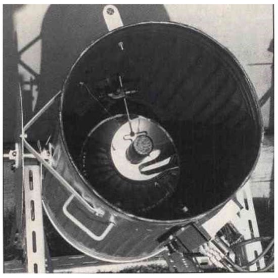 Starting in 1960, A. Chudakov and colleagues built the first system of 12 telescopes with a total mirror area of 21 m2 in Crimea, near the shore of the Black Sea [11]. They intended to find out whether one can (relatively easily) measure a signal from some “prominent” celestial source candidates. These telescopes were simple parabolic searchlight mirrors of F/D = 0.6 m/1.55 m design with single 5 cm diameter PMTs in their foci. A diaphragm provided an aperture of 1.75° FWHM. To reduce the large aberrations and to improve the signal timing Chudakov designed a special lens set in front of the PMTs. Each of the four independent mechanical mounts, set next to each other, carried three rigidly connected telescopes, see Figure 3. The pointing precision was 0.2° and 0.4° in elevation and azimuth, respectively. A coincidence system between these four telescopes had an advanced feature—a simple rate-stabilizing electronic circuit for counter-acting the variations of the light of the night sky (LoNS).