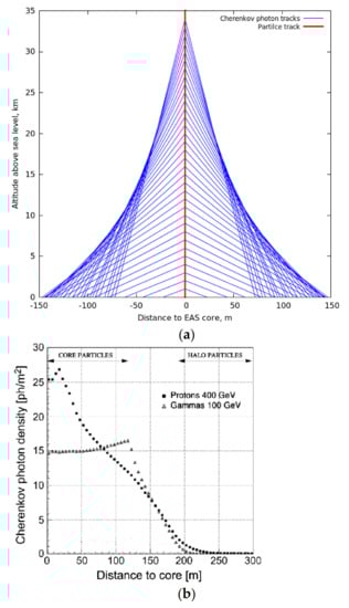 Please note that due to the flatter “plateau” of the lateral distribution of Cherenkov light from gammas compared to hadrons, the separated by 50–100 m distance arrays of telescopes could preferentially trigger on gammas at the hardware level (see Figure 2b).
