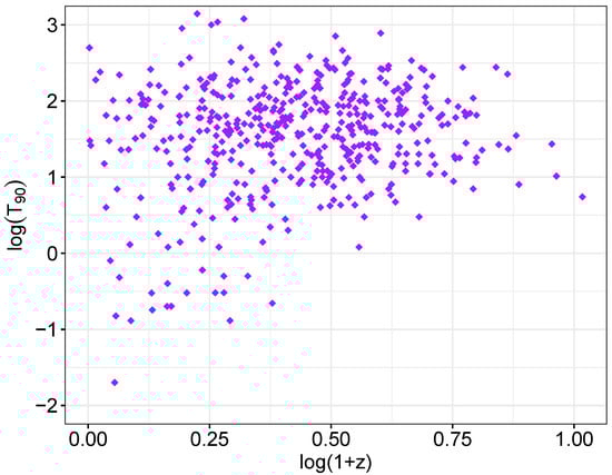 - Tarnopolski, M. Can the Cosmological Dilation Explain the Skewness in the Gamma-Ray Burst Duration Distribution? Astrophys. J. 2020, 897, 77. [Google Scholar] [CrossRef]