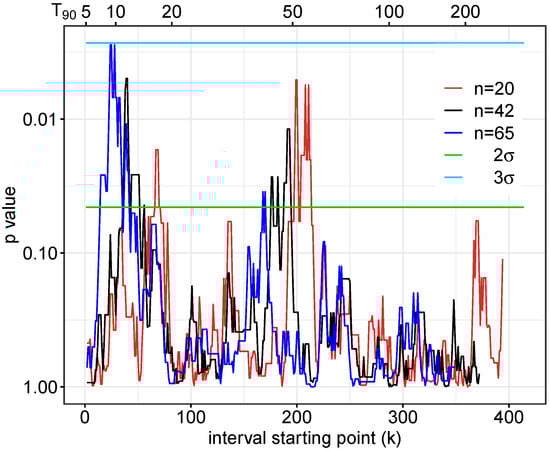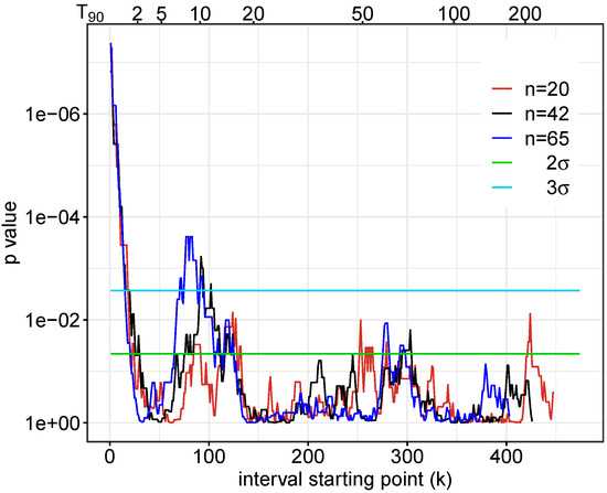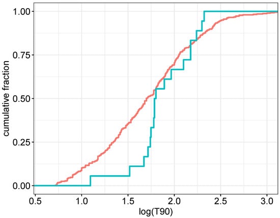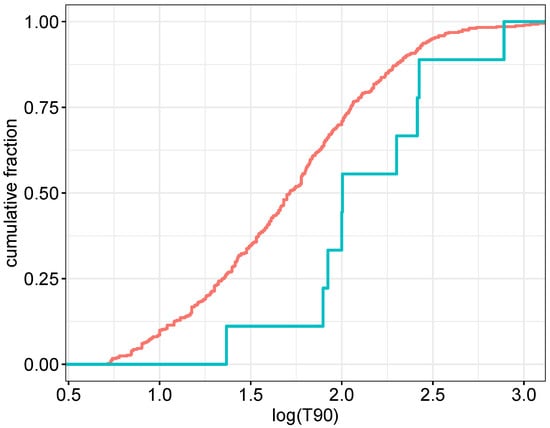 - Koshut, T.M.; Paciesas, W.S.; Kouveliotou, C.; van Paradijs, J.; Pendleton, G.N.; Fishman, G.J.; Meegan, C.A. Systematic Effects on Duration Measurements of Gamma-Ray Bursts. Astrophys. J. 1996, 463, 570. [Google Scholar] [CrossRef]