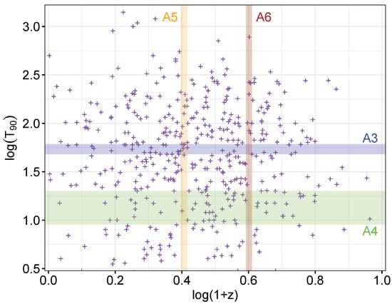 - Hakkila, J.; Haglin, D.J.; Pendleton, G.N.; Mallozzi, R.S.; Meegan, C.A.; Roiger, R.J. Gamma-Ray Burst Class Properties. Astrophys. J. 2000, 538, 165–180. [Google Scholar] [CrossRef]