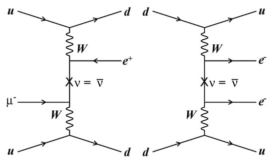 A generic model of neutrino masses includes at least three light, left-handed neutrinos, with neutrino flavor oscillations described by the Pontecorvo–Maki–Nakagawa–Sakata (PMNS) matrix [,,]. A right-handed neutrino, or any other hypothetical neutrino, may have significantly larger mass than the light neutrinos, as is expected, for example, from the Seesaw Mechanism [,,,,,]. In the minimal extension of the SM with a Majorana neutrino, the process is allowed through a light or heavy Majorana neutrino exchange, as depicted in Figure 1. However, as described before, it is also possible that other new particles beyond the SM or new interactions between quarks and leptons may mediate the interaction.