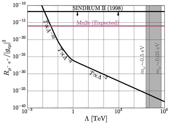 Any interaction other than the tree-level interaction depicted in Figure 1 may lead to . This was studied by Berryman et al. [] by using an effective operator description and normalizing the estimation of the Majorana neutrino exchange case (including one- and two-loop corrections) with the above tree-level calculation. The conversion rate was estimated according to the new physics energy scale (), shown in Figure 2. From the expected sensitivity of Mu2e, the new physics energy scale accessible from a measurement is comparably low, around 40 GeV, compared to the new physics scale accessible from a measurement at Mu2e of TeV. For all possible interactions leading to and , the new physics scale reach of searches is a few orders of magnitude smaller than experiments. According to Berryman et al. [], the observation of would imply the following: first, that the neutrino is a Majorana fermion; second, that flavor effects suppress while enhancing ; and third, that a combination of complex interactions other than the tree-level interaction is responsible for the physics of nonzero neutrino mass.