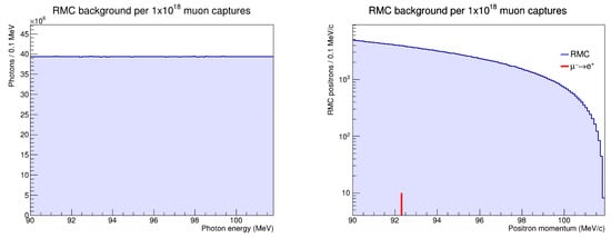We also make the following simplifying assumptions: all energies from a photon conversion are equally likely, such that the energy-sharing distribution between the pair is flat, there is a 0.1% chance of a photon conversion in the nuclear target, and the tracking efficiency for ∼90 MeV/c positrons is 10%. This leads to a positron background rate of and events per MeV/c at 90 MeV/c for COMET Phase-I and Mu2e respectively, before considering internal photon conversions, as shown in Figure 5. In this simple model, which is consistent with the existing data on aluminum, the RMC background estimate would change from below 1 background event to 10s of thousands of background events near the signal for muon captures, significantly lessening the discovery potential of signal searches.
