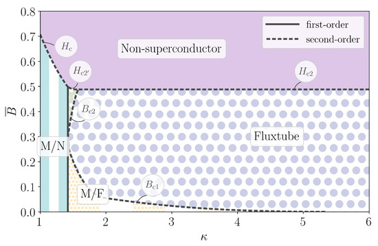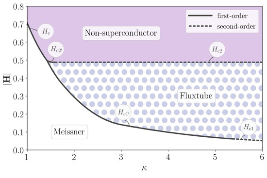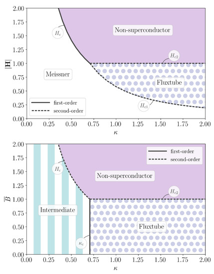 In an unbounded domain, the ground state in this experiment is guaranteed to be homogeneous, and hence the phase diagram is generally simpler. For later reference, we present in Figure 1 the phase diagrams for a single-component Ginzburg–Landau superconductor, i.e., we discuss its state as a function of the Ginzburg–Landau parameter, . (For more details, we refer the reader to standard textbooks on superconductivity, e.g., Tinkham [52]). For , we have a type-I superconductor; when is used as the control parameter, there is a first-order transition between the Meissner state (with ) and the non-superconducting state (with ) at the critical value in our dimensionless units. When the mean magnetic flux, , is used as the control parameter, this discontinuity resolves into an intermediate phase for , in which Meissner regions alternate with non-superconducting ones. For , on the other hand, we have a type-II superconductor; for the magnetic flux organizes into a hexagonal lattice of discrete fluxtubes. The transitions at the lower critical field, , and the upper critical field, , are both second-order, because fluxtubes appear with infinite separation at , and the superconductor density becomes vanishingly small at . In our dimensionless units, and , where is the energy per unit length of a single fluxtube. When is the control parameter, there is a similar second-order transition at , and a first-order transition between the intermediate and fluxtube states at .