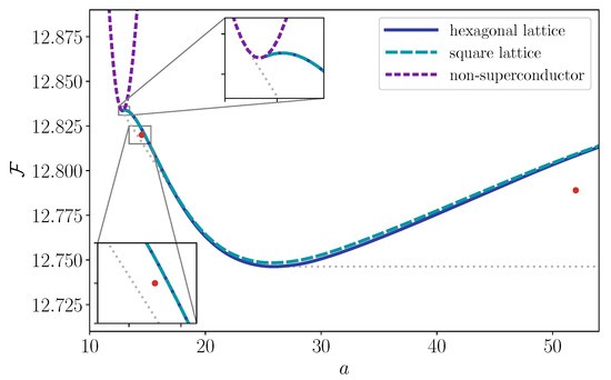 for one particular set of parameters, whose motivation is explained later, in Section 5. Note that in the case of a fluxtube lattice, a corresponds to the area of a single Wigner–Seitz cell. This plot was produced by finding the minimum value of for both square and hexagonal lattices for domains of various sizes. We also plot the energy in the non-superconducting state, which has and a uniform magnetic field , and is known analytically (see Section 4.1).