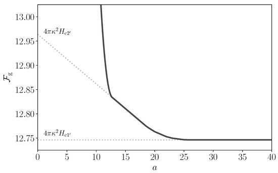 The purple, short-dashed curve in Figure 2 represents the free energy per unit length per quantum of flux in the non-superconducting state. From Equation (12), we obtain