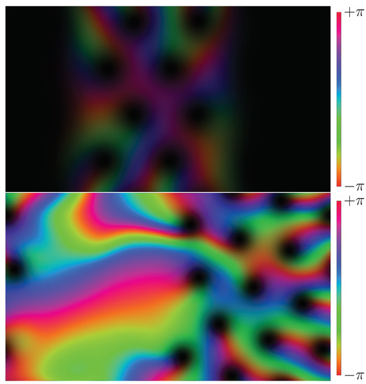 We emphasize that the function represents the minimum free energy only for a hypothetical unbounded domain, free from any geometrical constraints. In any simulation with a finite domain size, the free energy in the ground state will generally exceed this value. Nevertheless, by using a large enough computational domain, and choosing values of a within the appropriate ranges, we can obtain examples of the inhomogeneous ground states described above. Figure 4 shows two such examples, with and . These values of a were chosen so that in each case approximately half of the domain contains a hexagonal lattice. As shown in Figure 2, in each case the free energy is lower than that of a pure lattice, but still significantly higher than for the true ground state in an unbounded domain.