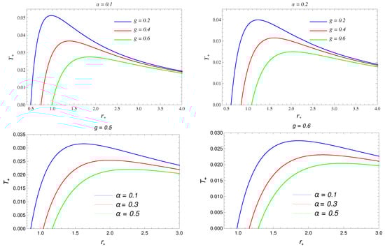 We depict the Hawking temperature behavior with horizon radius for different values of g and in Figure 2. It is evident that, during the Hawking evaporation, as the black hole horizon size shrinks, the temperature initially increases with decreasing , reaches a maximum value, and then rapidly decreases and eventually vanishes for some particular value of . The vanishing temperature implies the extremal black hole with degenerate horizons, such that corresponds to the no-black hole states. The Hawking temperature possesses a local maximum at a particular value of horizon radius, say – critical horizon radius. Since the Hawking temperature has the maximum value at , the first derivative of the temperature vanishes at a critical radius, leading to the divergence of specific heat. The value of critical horizon radius increases with magnetic monopole charge g and GB coupling constant (cf. Figure 2). By taking into account the first law of black hole thermodynamics, , we obtain the entropy of the black hole as [,]