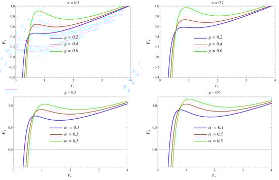 The presence of coordinate singularity of the metric Equation (9) at signifies the existence of the horizons, which are the real and positive roots of the equation