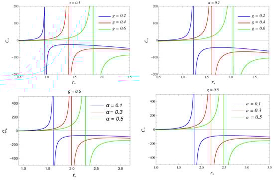 The numerical results of specific heat () for varying horizon radius for different values of g and of Bardeen black holes in EGB gravity is shown in Figure 4. Specific heat diverges and flips its sign from positive to negative at a critical radius ; hence the black hole exhibits a second-order phase transition which takes the black hole from a local stable state to an unstable state. Hence, the black holes with smaller horizon radius are locally stable, whereas the black holes with larger horizon radius are locally unstable. Further, a black hole is always globally thermodynamically unstable for all . Moreover, the black hole temperature increases with increasing for , whereas it decreases for (cf. Figure 2). Interestingly, the value of the critical radius increases as we increase the value of g and .