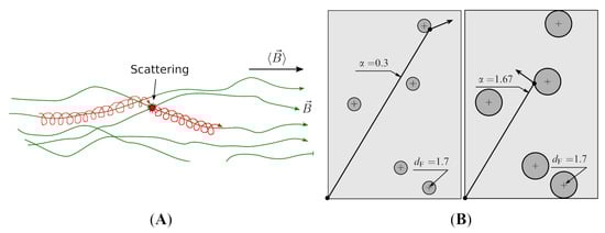 Qualitative sketches of CR particle trajectories in two different models. (A)—in the wave model; (B)—in the cloud model ( are free path distribution indices, are clouds diameters).