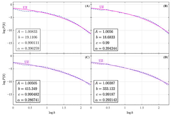 Figure 5 shows the relation to the ISM power spectra of the numerically generated three-dimensional MHD-turbulence by using the MHD code [32] and varying the input values for the sonic and Alfvénic Mach numbers that were presented in [33]. Figure 5A relates to the power spectra line with a greater Alfvénic-Mach number and the thick case of varying abundances; Figure 5B is the same with a lower Alfvénic-Mach number and the thick case; Figure 5C is the same with a greater Alfvénic-Mach number and the normal case; Figure 5D is same with a greater Alfvénic-Mach number and the normal case. This time, the quality of the UZ approximation is more than satisfactory.