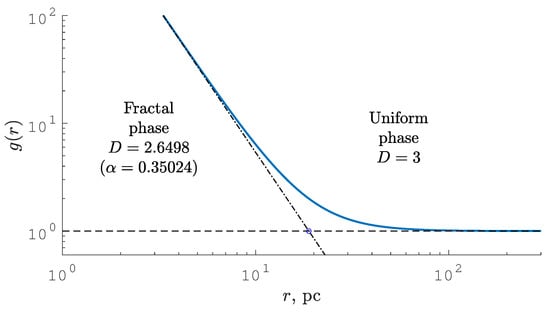 (2) More information can be obtained from the structure function, calculated for the mesofractal medium (Figure 6). The structure function shows the conditional density of objects (in this case, molecular clouds) at a distance r from a randomly selected object. It can be seen that the nearest neighbors are distributed according to the fractal law, while the distribution of distant neighbors decreases according to the exponential law. As the point of mode change (crossover), the point of intersection of two asymptotes is chosen, the coordinate of which is determined by the formula: