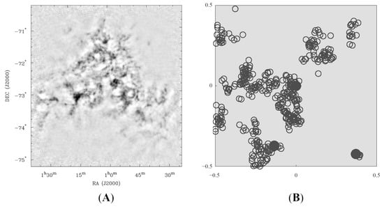 (4) The authors of [38] combined new Parkes telescope observations of neutral hydrogen (Hı) in the Small Magellanic Cloud (SMC) with an Australia Telescope Compact Array (ATCA) aperture synthesis mosaic to obtain a set of images sensitive to all angular (spatial) scales between 98 arcsec (30 pc) and 48 arcsec (4 kpc). The spatial power spectrum closely obeys the relation , with . The authors’ interpretation was that the interstellar medium (ISM) of the SMC is fractal in nature, consisting of a hierarchy of Hı cloud structures created, for example, by homogeneous turbulence. The projected fractal dimension of is similar to the values obtained by other authors for molecular clouds in the Galaxy in the size range of pc. Such a model is consistent with a low space-filling factor for the neutral gas, and the image of it is shown on Figure 7A. Figure 7B shows an image of an ISM fragment containing three distinct clusters of molecular clouds. It is worth emphasizing that their formation itself was in no way provoked by the computer code, which built independent random trajectories from independent random segments. The appearance of clusters against the background of a uniform Poisson field of seed nodes is a consequence of the statistical feature of Lévy walks. Nevertheless, on both pairs of drawings, some common features are visible, not the sizes and arrangements of similar parts, but some commonality of their configurations.