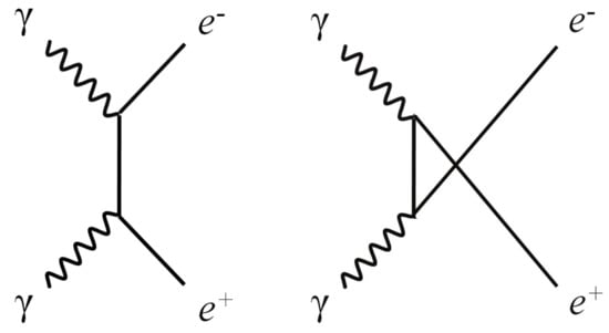 - Gould, R.J.; Schreder, G.P. Pair production in photon-photon collisions. Phys. Rev. 1967, 155, 1404. [Google Scholar] [CrossRef]