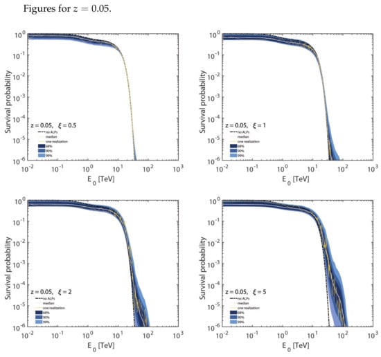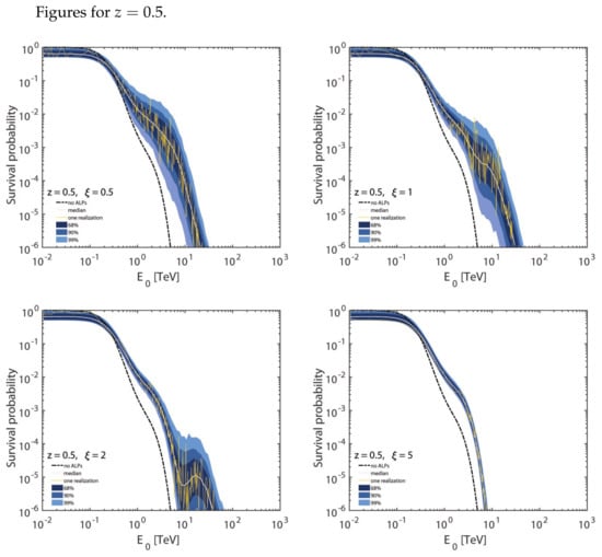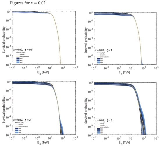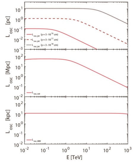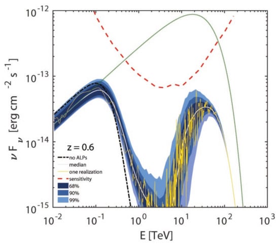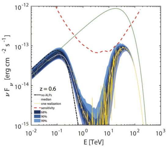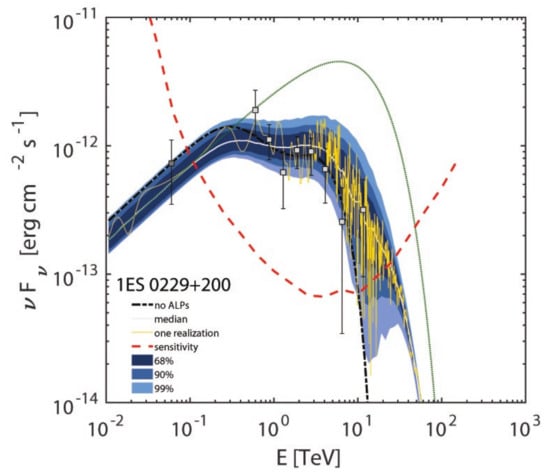 - In another region of the parameter plane —which can overlap with the previous one—ALPs give rise to very interesting astrophysical effects (for a very incomplete list of references, see [39,40,41,42,43,44,45,46,47,48,49,50,51,52,53,54,55,56,57,58,59,60,61,62,63,64,65,66,67,68,69,70,71,72,73,74,75,76,77,78,79,80,81,82,83,84,85,86,87,88,89,90,91,92,93,94,95,96,97,98,99,100,101,102,103,104,105,106,107,108,109,110,111,112,113,114,115,116,117,118,119,120,121,122,123,124,125,126,127,128,129]. In particular, we shall see that ALPs can be indirectly detected by the new generation of gamma-ray observatories, such as CTA (Cherenkov Telescope Array) [130], HAWC (High-Altitude Water Cherenkov Observatory) [131], GAMMA-400 (High-Altitude Water Cherenkov Observatory) [132], LHAASO (High-Altitude Water Cherenkov Observatory) [133], TAIGA-HiSCORE (Hundred Square km Cosmic Origin Explorer) [134] and HERD (High Energy cosmic-Radiation Detection) [135].