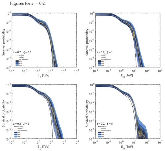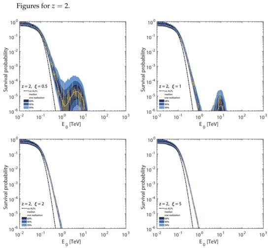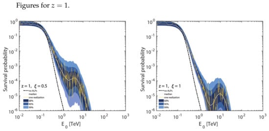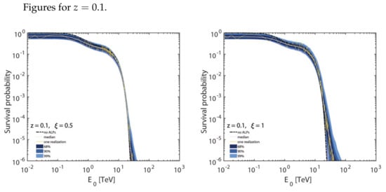 Section 5 describes the propagation of a photon beam in the -ray band—emitted by a far-away source with redshift z—in extragalactic space and observed on Earth at energy . Extragalactic space is supposed to be magnetized, and so oscillations should take place in the beam as it propagates. Moreover, the extragalactic magnetic field is modeled as a domain-like structure—which mimics the real physical situation—with the strength of nearly equal in all domains, the size of all domains being taken equal and set by the coherence length while the direction of jumps randomly and abruptly from one domain to the next. Because of the latter fact, this model is called domain-like sharp edge model (DLSHE), and is adequate for beam energies currently detected (up to a few TeV) since the oscillation length is very much larger than . It is just during propagation that an important effect of the presence of ALPs comes about. What happens is that the very-high-energy (VHE, ) beam photons scatter off background infrared/optical/ultraviolet photons, which are nothing but the light emitted by stars during the whole evolution of the Universe, called extragalactic background light (EBL). Owing to the Breit-Wheeler process [143], the beam undergoes a frequency-dependent attenuation1. However in the presence of oscillations photons acquire a ‘split personality’: for some time they behave as a true photon—thereby undergoing EBL absorption—but for some time they behave as ALPs, which are totally unaffected by the EBL and propagate freely. Therefore, now the optical depth is smaller than in conventional physics. However since the corresponding photon survival probability is , even a small decrease in gives rise to a much larger photon survival probability as compared to the case of conventional physics. This is the crux of the argument, first realized in 2007 by De Angelis, Roncadelli and Mansutti [52].