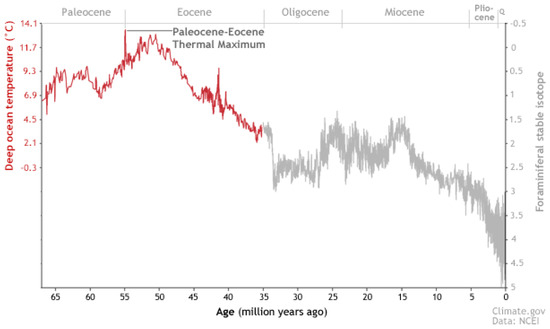 The deep ocean temperatures versus time, extended over a range of epochs from the Paleocene to the Pliocene. The temperatures in the distant past were calculated using oxygen isotope ratios from fossil foraminifera (one-celled protists, eukaryotic organisms), while the red part of the plot assumes an ice-free ocean and the gray part does not. A thermal maximum approximately 55 Myrs ago is clearly seen. The graph is by Hunter Allen and Michon Scott, using data from the NOAA National Climatic Data Center, courtesy of Carrie Morrill. For details see https://www.climate.gov/news-features/features/models-and-fossils-face-over-one-hottest-periods-earths-history (accessed on 20 March 2022).