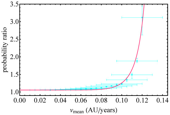 The cyan points correspond to the ratio of the probability for comets to enter our Solar system after the gravitational transition, over the same probability before the transition, for different values of random initial velocity perturbations () on the initial comet velocity. The red line corresponds to a non linear fit of the numerical results in the form of an exponential function.